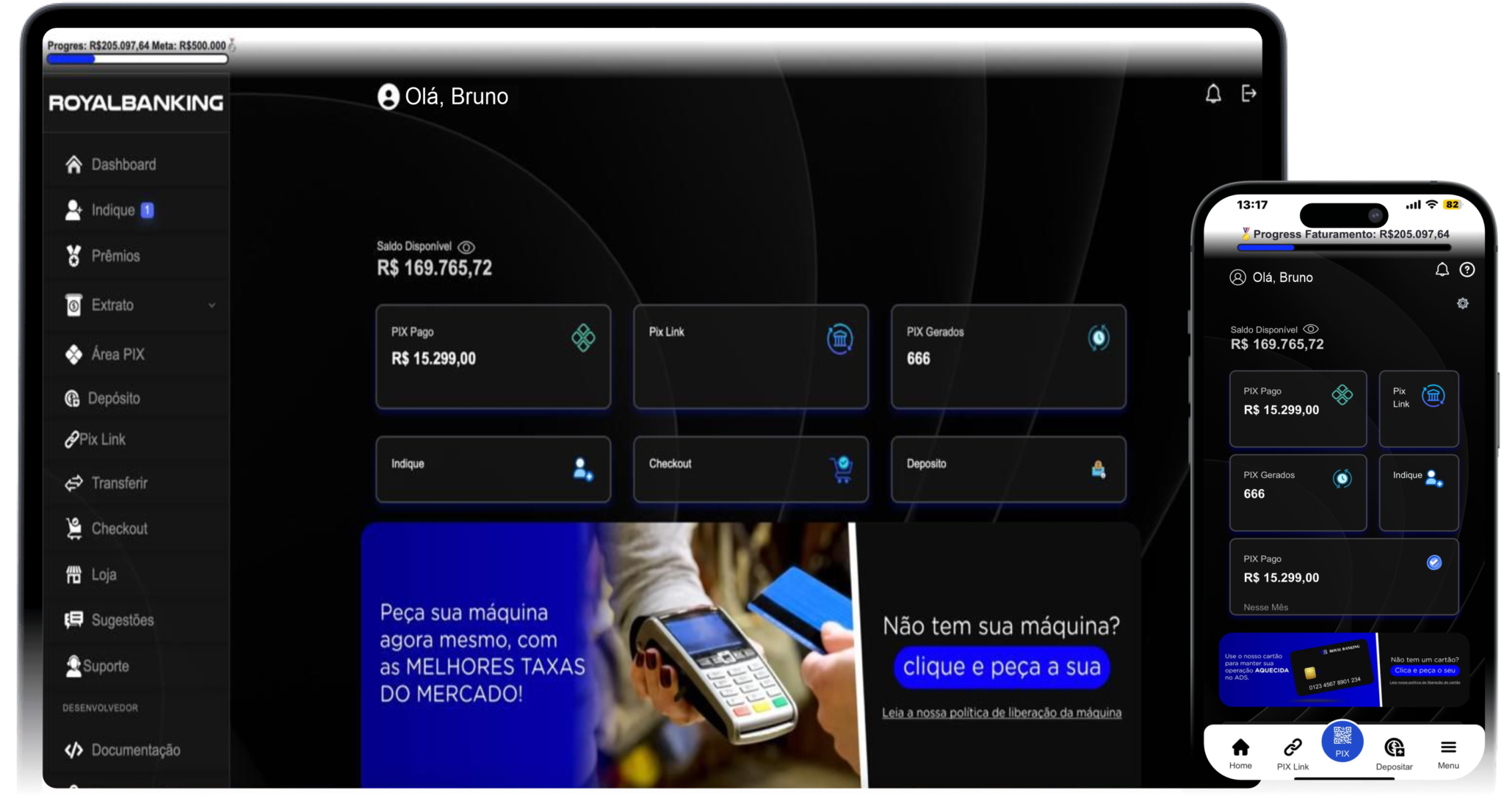 Para quem busca personalização e controle total, oferecemos integração via API. Conecte o RoyalBanking diretamente ao seu sistema de forma simples e segura, e tenha acesso a todas as funcionalidades do nosso banco de pagamentos com a flexibilidade que você precisa.